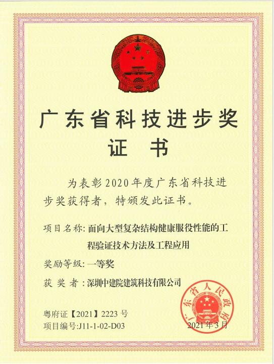 5月20日上午,廣東省科技創(chuàng)新大會在廣州召開,大會頒發(fā)了2020年度廣東省科學技術(shù)獎。深圳中建院建筑科技有限公司繼2018年之后,再度榮獲廣東省科學技術(shù)獎一等獎。獲獎項目《面向大型復雜結(jié)構(gòu)健康服役性能的工程驗證技術(shù)方法及工程應用》,是以哈爾濱工業(yè)大學(深圳)(下稱哈工大)滕軍教授團隊、深圳中建院建筑科技有限公司(下稱深圳中建院)何春凱研究員等作為主要參與人,哈工大、中建四局、深圳中建院共同完成的課題。