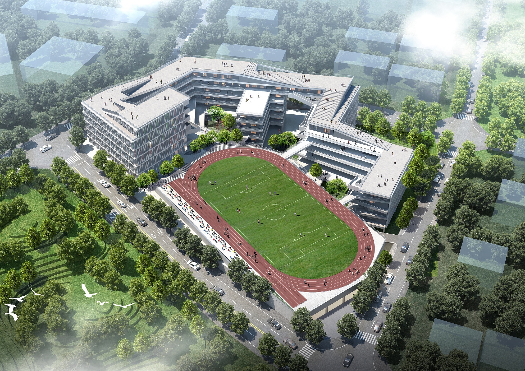 因地制宜的同時,方案也將先進的設計理念與校園建筑相融合。通過對教育發展變化的理解和預測,力求打造一個能長期服務于基礎教育的教學空間,對校園建筑設計的現代化、網絡化、綠色生態發展方面進行了深刻解讀。設計中盡可能地考慮到長遠的教學技術利用與更新,日常信息的交換與流通以及優美舒適的園林化校園環境的搭建,以期達到設計的前瞻性和校園建筑與周邊環境和諧共生的目標。